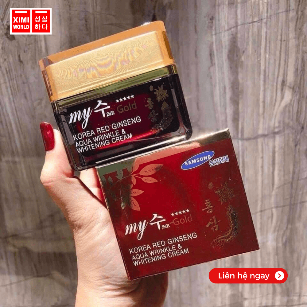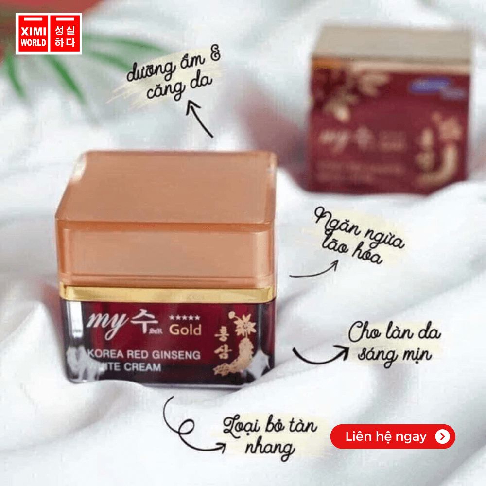 KEM SÂM MY GOLD- LÀN DA CĂNG BÓNG, DA MỤN- THÂM HOẶC NHẠY CẢM NHẤT VẪN DÙNG ĐƯỢC Kem sâm Hàn Quốc My Gold Korea Red Ginseng White Cream bổ sung tinh chất nhân sâm làm mịn và trắng da hiệu quả, ngoài ra còn giúp giảm nhờn, chống lão hóa và làm se khít lỗ chân lông làm giảm các vết thâm nám, làm đều màu da hiệu quả.