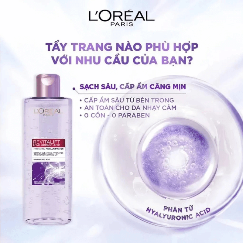 REVIEW NƯỚC TẨY TRANG LOREAL MÀU TÍM REVITALIFT HYALURONIC ACID MICELLAR WATER CẤP ẨM, CĂNG MỊN DA