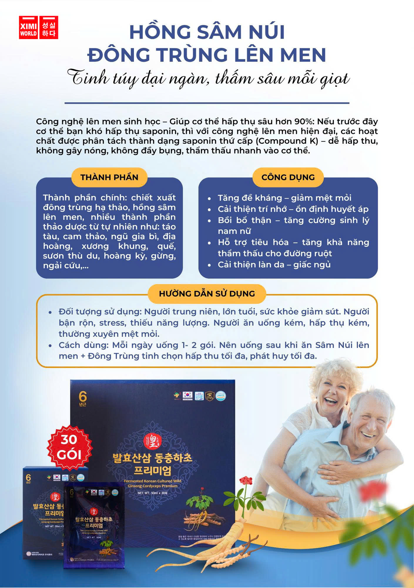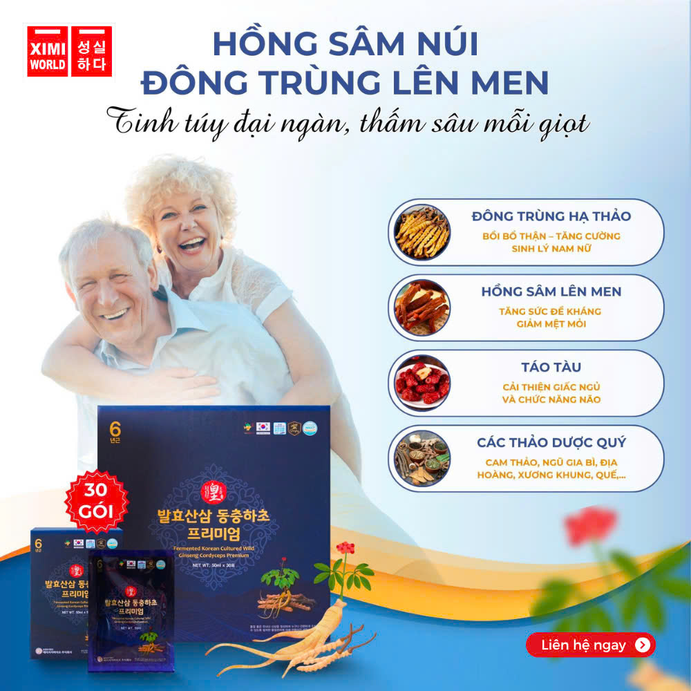 Nước Sâm Núi Lên Men Đông Trùng Ginseng King Fermented Korean Cultured Wild Ginseng Cordyceps Premium (30 gói x 50ml) là sản phẩm nước uống sức khỏe cao cấp đến từ Hàn Quốc, kết hợp giữa sâm núi nuôi cấy quý hiếm, đông trùng hạ thảo và công nghệ lên men hiện đại. Sản phẩm được thiết kế nhằm mang lại hiệu quả vượt trội trong việc bồi bổ – phục hồi – tăng cường sinh lực, phù hợp cho cả người già, người suy nhược hoặc cần tăng sức đề kháng.