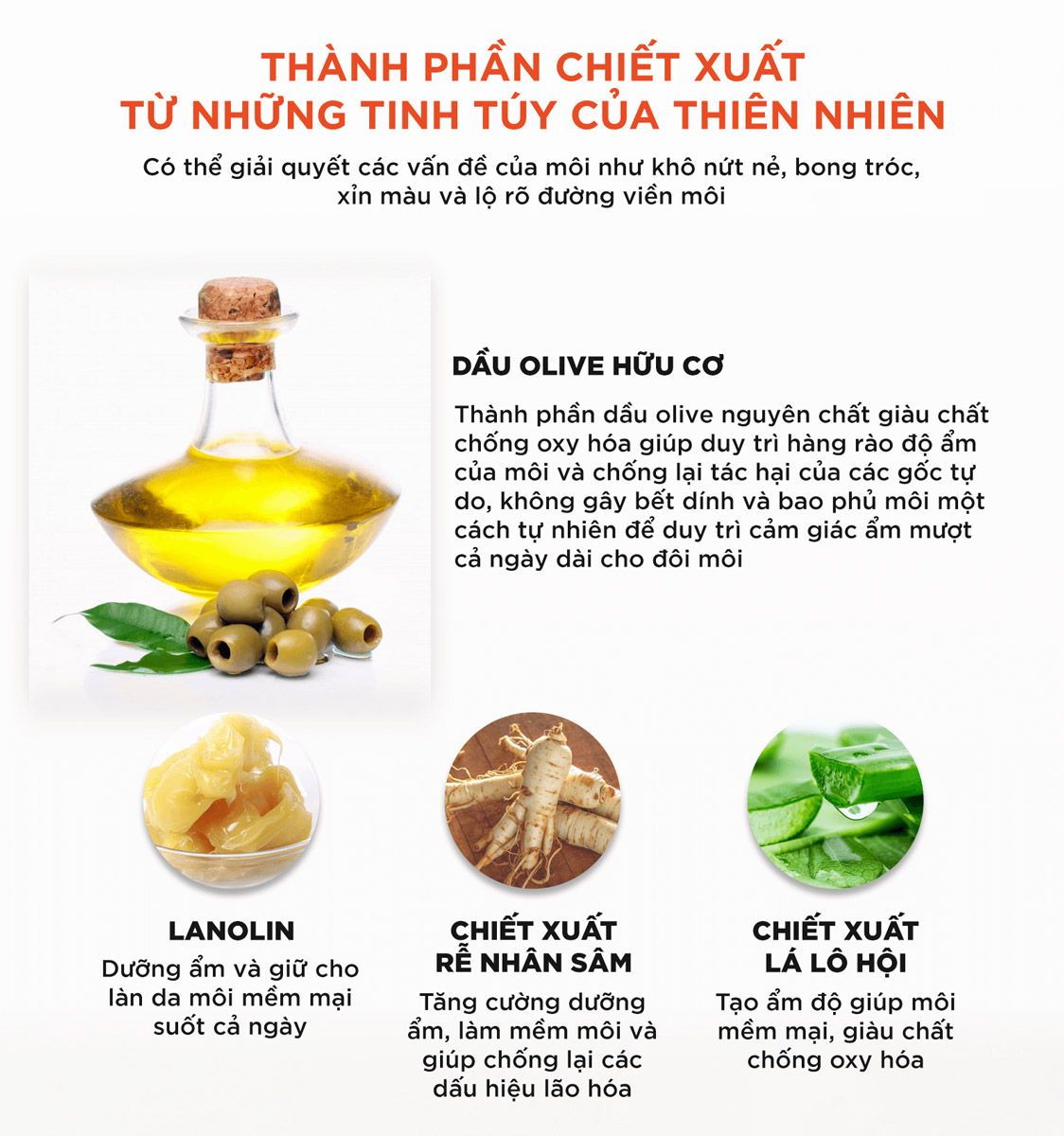 + Olea Europaea (Olive) Fruit Oil (dầu oliu nguyên chất), Lanolin Oil (mỡ cừu), Aloe Barbadensis Leaf Extract (chiết xuất lá lô hội): bổ sung dưỡng chất giúp dưỡng ẩm môi hiệu quả.