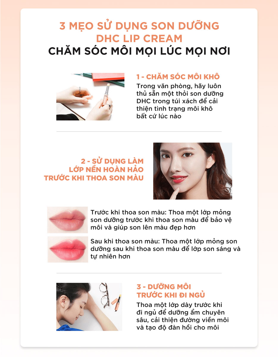 Có thể thoa son dưỡng DHC không màu trước khi thoa các loại son kem, son lì có màu giúp son lên
