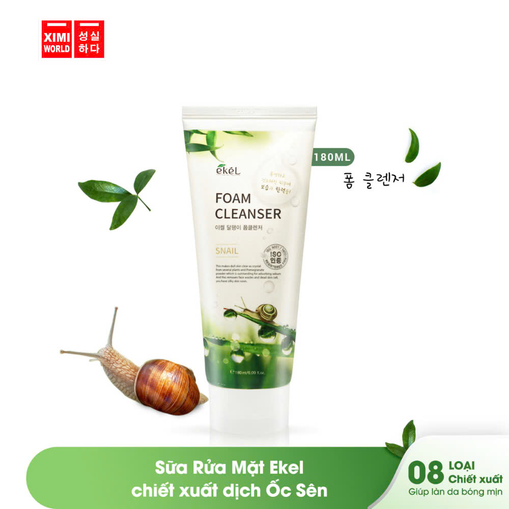 Sữa rửa mặt Ekel chính hãng Hàn Quốc được chiết xuất từ các tinh chất trà xanh, chất nhầy ốc sên, than hoạt tính, dưa leo, hạt lựu, gạo