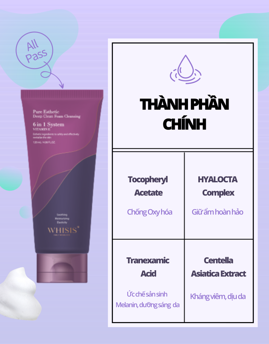 WHISIS Pure Esthetic Deep Clean Foam Cleansing bổ sung Vitamin E, ngoài khả năng làm sạch sâu còn hỗ trợ dưỡng sáng và chống oxy hóa. Chất kem mềm mịn, tạo bọt vừa đủ và không làm khô da sau khi sử dụng.