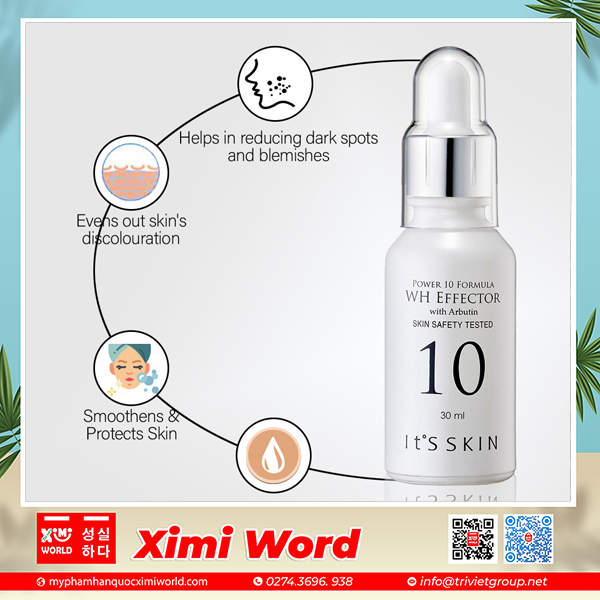It’S SKIN Power 10 Formula WH Effector là dòng tinh chất dưỡng da đến từ thương hiệu mỹ phẩm It’s Skin của Hàn Quốc, với chiết xuất từ Arbutin, cúc La Mã, vỏ rễ cây dâu tằm có tác dụng tổng hợp giúp ngăn ngừa sự phát triển các hắc tố đen melamin, hạn chế sự hình thành các vết thâm, tàn nhang, các nốt ruồi bất thường cho làn da rạng rỡ, đầy sức sống.