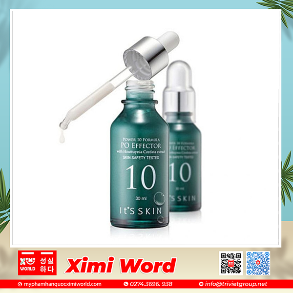 It’S SKIN Power 10 Formula PO Effector là dòng tinh chất đến từ thương hiệu mỹ phẩm It’s Skin của Hàn Quốc, sản phẩm serum được thiết kế riêng cho những làn da đang gặp tình trạng lỗ chân lông to, giúp chăm sóc lỗ chân lông, cân bằng độ ẩm và điều tiết lượng dầu thừa trên da, hỗ trợ se khít lỗ chân lông và mang đến làn da mịn màng. Thành phần chính là sự kết hợp của chiết xuất rau diếp cá và 4 loại chiết xuất thực vật cô đặc có tác dụng trong việc thu nhỏ lỗ chân lông (hoàng bách, ngũ vị tử, dã sơn, mơ) sẽ giúp duy trì làn da sạch khỏe và tươi sáng.